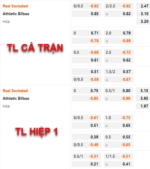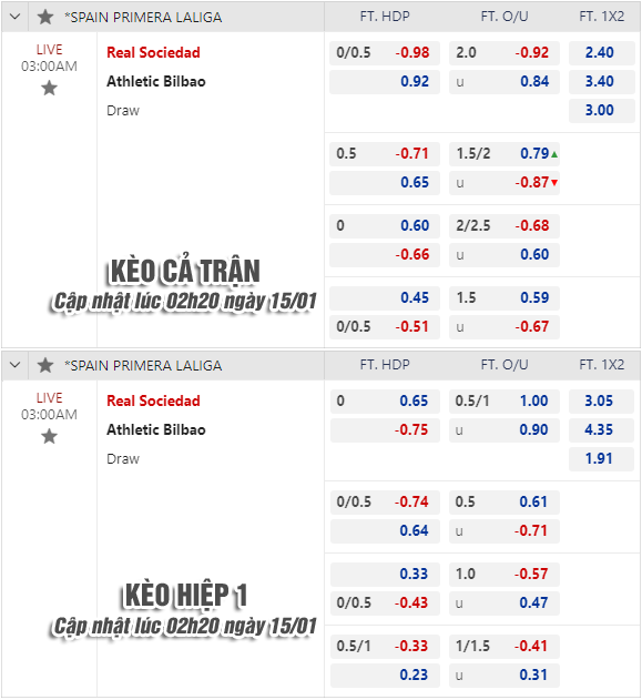AEGoal chốt kèo bóng đá trực tiếp trận Sociedad vs Bilbao diễn ra lúc 03h00 ngày 15/01 trong khuôn khổ giải VĐQG Tây Ban Nha sau khi dựa trên tính toán, chuyển động về kèo châu Á và đội hình ra sân của 2 đội.