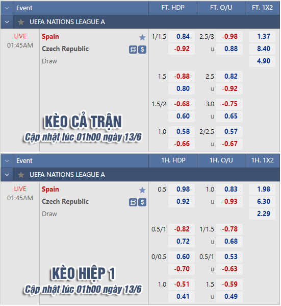 * Chốt kèo trận Tây Ban Nha vs Séc (01h45 ngày 13/6)