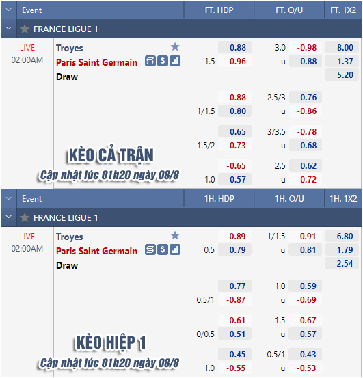* Chốt kèo trận Troyes vs PSG (02h00 ngày 08/08)