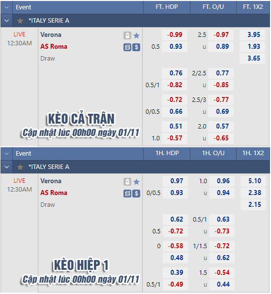 * Chốt kèo trận Verona vs AS Roma (00h30 ngày 1/11)