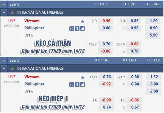 * Chốt kèo trận Việt Nam vs Philippines (18h00 ngày 14/12)
