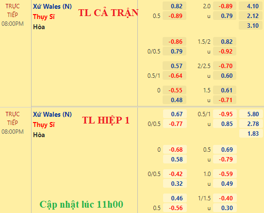 Hết hiệp đấu đầu tiên nhưng Thụy Sĩ vẫn duy trì được kèo chấp hòa cùng lợi nhuận cân bằng cho 2 cửa. ĐT xứ đồng hồ vẫn duy trì thế trận áp đảo và tạo ra nhiều cơ hội ngon ăn. Với kèo chấp cùng thế trận như vậy, cửa Thụy Sĩ trong hiệp 2 vẫn sáng giá.