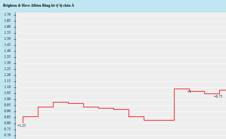Trở lại với trận đấu sớm nhất vòng 24 Ngoại hạng Anh giữa Brighton và Chelsea vẫn chứng kiến các nhà ĐKVĐ giảm điểm. Ban đầu xuất hiện trên sàn châu Á vói kèo chấp 1 1/4 cùng lợi nhuận cân bằng giữa các lựa chọn đối lập, nhưng đến cuối giờ chiều nay đã chứng kiến Chelsea chỉ chấp 3/4 cùng lợi nhuận cân bằng giữa các lựa chọn đối lập.