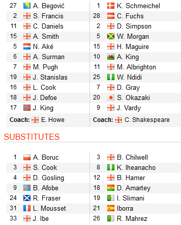 Như vậy, đội cựu vô địch chỉ còn hy vọng vào Vardy ở vị trí mũi nhọn trên hàng công. Trong khi đó, bên kia chiến tuyến Bournemouth vẫn tin dùng Defoe và Josua King với nhiệm vụ làm bàn. Đội chủ nhà nhìn chung có lực lượng tốt nhất ở trận đấu tối nay. Với những tình hình nhân sự và tỷ lệ hiện nay, đội khách bị đánh giá thấp so với thời điểm đầu phiên.