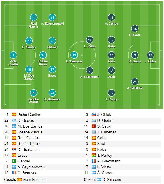 Mất khá nhiều sức sau cuộc đại chiến hồi giữa tuần tại Champions League với Chelsea, một số cầu thủ quan trọng của Atletico Madrid đã không thể có mặt trong đội hình chính ở trận này như Carrasco, Juanfran... Không những thế, nhìn vào đội hình ra sân với sơ đồ 3-5-2 của Atletico Madrid có thể nhận thấy cánh trái của đội bóng này có gì đó không ổn khi Correa được bố trí đá cánh phải trong hàng tiền vệ 5 người, đây là vị trí thường xuyên phải trám vào hỗ trợ cho hậu vệ cánh phải ử những tình huống cần phòng ngự, thế nhưng Correa là 1 cầu thủ có khả năng phòng thủ không cao.