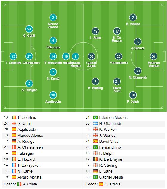 Trước 1 Man City đang thăng hoa trên hàng công, Chelsea rõ ràng là đã có những tính toán kỹ lưỡng cho cuộc đối đầu lần này với sơ đồ 3-5-1-1, với sơ đồ này, Chelsea sẽ rất cơ động trong khả năng phòng thủ chiều sâu khi 2 cánh của Marcos Alonso và Azpilicueta sẵn sàng lùi xuống để tạo nên hàng thủ 5 người. Trong khi bên phía Man City, việc thiếu vắng tiền đạo chủ lực Aguero do chấn thương từ tai nạn xe hơi sẽ có những ảnh hưởng không nhỏ cho hàng công của đội bóng này, hơn nữa việc sử dụng sơ đồ 4-3-3 trước 1 Chelsea đầy tinh quái sẽ không phải là 1 sự lựa chọn an toàn.