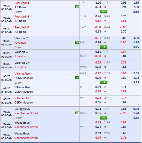 ĐKVĐ Real Madrid sẽ khởi động chiến dịch vô địch lần thứ 4 liên tiếp với trận tiếp AS Roma, đội đã tạo ra vô số bất ngờ ở mùa giải trước. Kền kền trắng được niêm yết tỷ lệ chấp tới 1 1/2 trong trận đấu này và cho thấy họ đang rất được lòng các nhà cái. Real cũng mới chỉ bị cầm hòa đúng 1 trận tại La Liga mùa này.