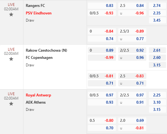 * Rangers vs PSV Eindhoven: Dù làm khách nhưng PSV Eindhoven lại duy trì được vị thế cửa trên, thậm chí điểm ăn còn ở mức đủ chứ không bỏ sâu như thời điểm sáng 22/8. Thực tế thì các đội bóng của Scotland có trình độ thấp hơn mặt bằng chung của châu Âu, khi ra các đấu trường Cúp thì thường không thể hiện được nhiều.