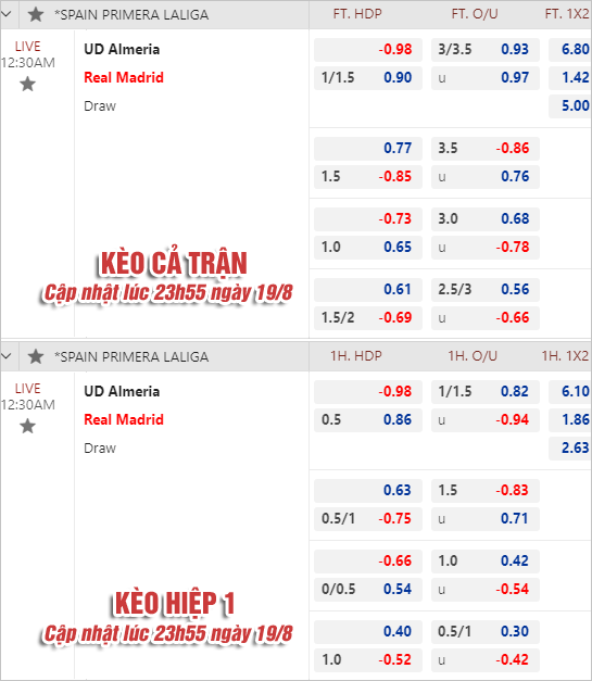 * Chốt kèo trận Almeria vs Real Madrid (00h30 ngày 20/8)