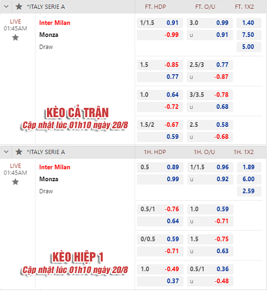 * Chốt kèo trận Inter Milan vs Monza (01h45 ngày 20/8)