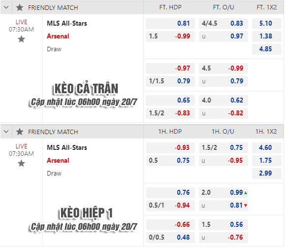Ra sân với đội hình không phải mạnh nhất, thế nhưng rõ ràng so với Các ngôi sao của giải Nhà nghề Mỹ, Arsenal vẫn hoàn toàn vượt trội về mặt trình độ. Trên thị trường, những diễn biến mới nhất cũng cho thấy sự tin tưởng vào Pháo thủ khi kèo chấp 1 1/4 của họ đã được nâng lên 1 1/2, vì thế đây rõ ràng vẫn được xem là cái tên đáng trông đợi hơn của trận đấu.