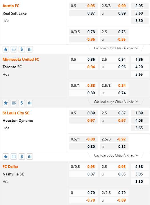 * Austin FC vs Real Salt Lake: Austin thiếu đi sức bật dù được chơi trên sân nhà trước đối thủ có phong độ bết bát. Chọn: Real Salt Lake +1/2 FT