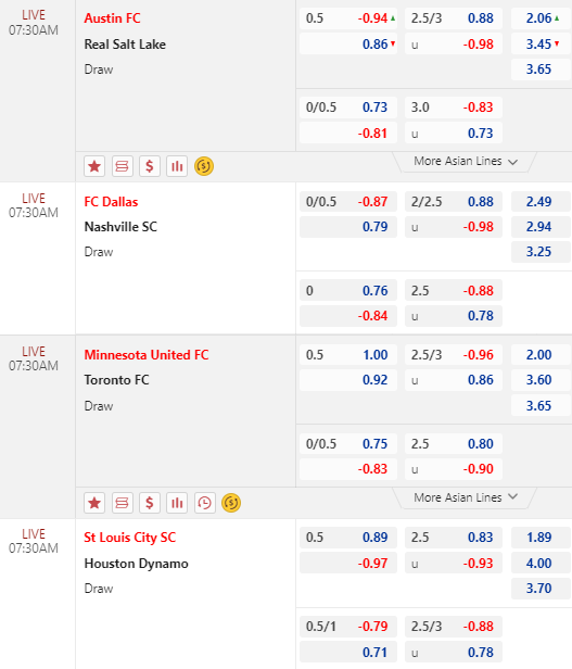 * FC Dallas vs Nashville: Càng sát giờ bóng lăn thì Dallas càng mất giá, kèo chấp 1/4 của họ có điểm bỏ sâu. Chọn: Nashville +1/4 FT