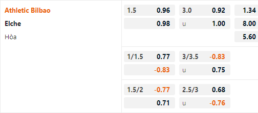 Bilbao vẫn duy trì mức chấp 1 1/2 trên sàn châu Á. Có thể thấy đây là mức chấp cao của đội chủ nhà so với lịch sử đối đầu. Bilbao có động lực lớn giành chiến thắng trận này để cạnh tranh vị trí tham dự cúp Châu Âu trong khi Elche đã xuống hạng và không còn nhiều quyết tâm thi đấu. Cửa trên sẽ là lựa chọn hợp lý