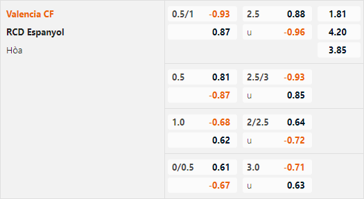 Tỷ lệ chấp của Valencia được điều chỉnh tăng từ 1/2 thời điểm sáng nay lên mức 3/4 ở thời điểm hiện tại. Đây là tín hiệu tốt cho lựa chọn cửa trên. Espanyol cần phải thắng để hy vọng trụ hạng nhưng việc đẩy đội hình lên tìm kiếm bàn thắng cũng là cơ hội tốt cho Valencia có một trận thắng.