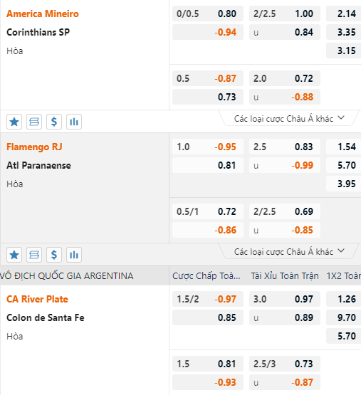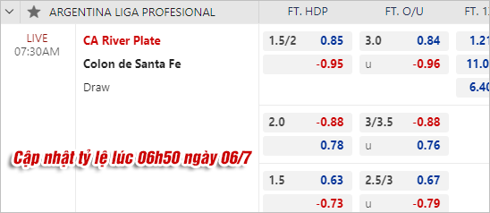 Trong những diễn biến mới nhất trên sàn giao dịch châu Á, River Plate đang tiếp tục duy trì kèo chấp 1 3/4, thậm chí điểm ăn còn trên đà giảm, điều này càng củng cố niềm tin cho đội chủ nhà. Ở kèo tổng bàn thắng, mốc 3 hòa cũng được giữ nguyên cùng điểm ăn giảm mạnh ở cửa Tài, điều này cũng cho thấy hứa hẹn vào 1 kịch bản tưng bừng.