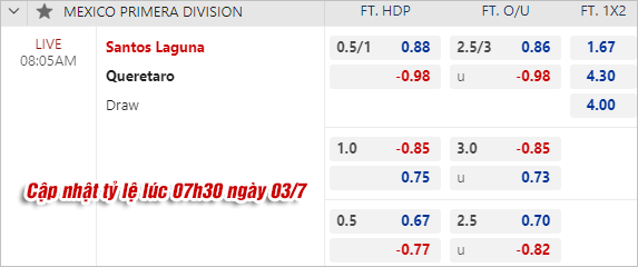 Chốt kèo: Santos Laguna -3/4 FT và Tài 2 3/4 FT