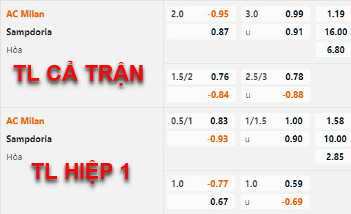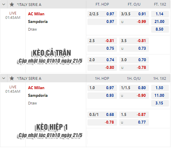 * Chốt kèo trận AC Milan vs Sampdoria (01h45 ngày 21/5)