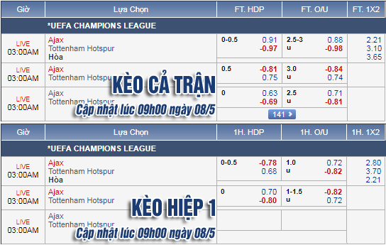 AEGoal.net chốt kèo trực tiếp trận Ajax vs Tottenham diễn ra lúc 02h00 ngày 09/5 sau khi dựa trên tính toán, chuyển động về kèo châu Á và đội hình ra sân của 2 đội.