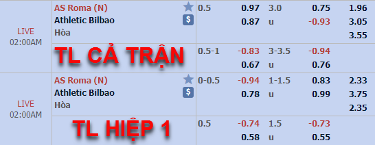 Tỷ lệ của trận đấu đã có những biến động đang kể trên sàn giao dịch châu Á. Kèo chấp chính 3/4 của AS Roma chiều qua đã được nhà cái thay thế bằng tỷ lệ chấp 1/2. Sự thay đổi này đem lại dấu hiệu không tốt cho việc lựa chọn cửa trên trong trận đấu này, với sức mạnh hiện tại của Roma thì việc đánh bại Bilbao không phải là việc dễ dàng của thày trò HLV Paulo Fonseca.