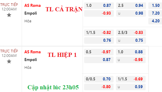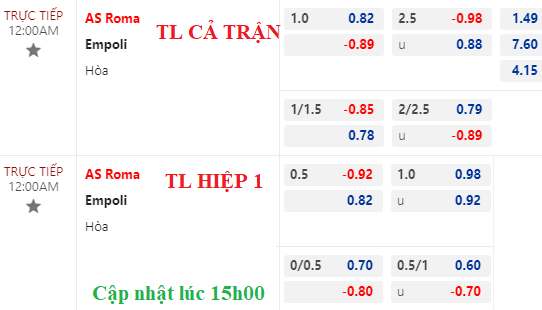 Chốt kèo trực tiếp trận AS Roma vs Empoli (00h00):