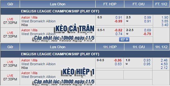 - Trận đấu: Aston Villa vs West Brom (Play-off thăng hạng - Hạng Nhất Anh)