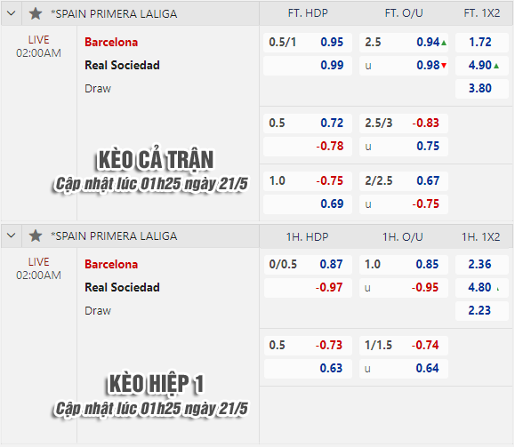* Chốt kèo trận Barcelona vs Sociedad (02h00 ngày 21/5)