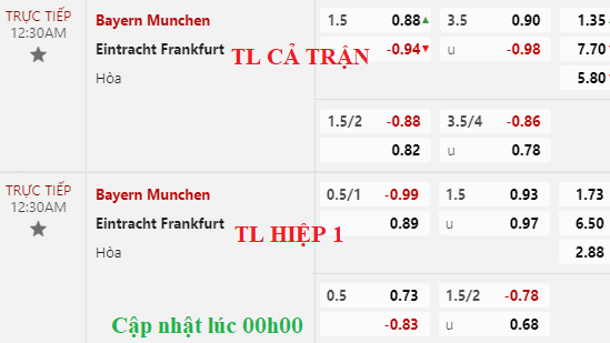 Bayern Munich mất giá khi về chấp 1 1/2 với điểm ăn thấp hơn cửa dưới. Nhưng tài xỉu vẫn giữ nguyên ở mốc 3 1/2 với lợi nhuận không chênh lệch là bao giữa các lựa chọn đối lập.