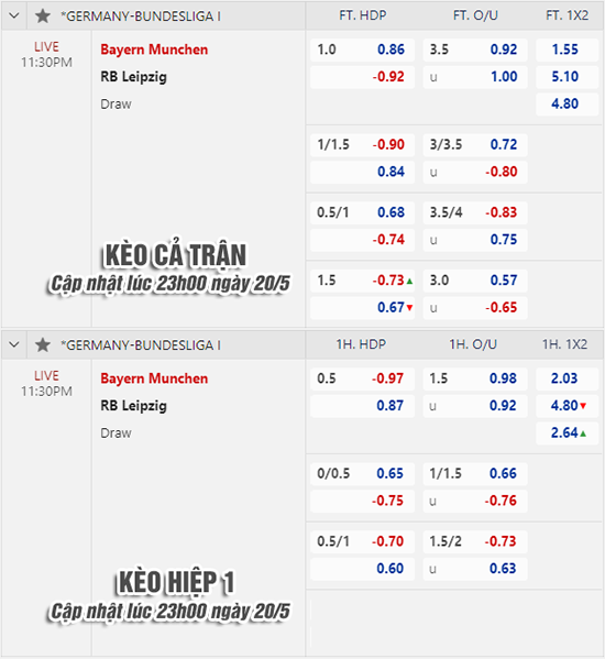 * Chốt kèo trận Bayern Munich vs RB Leipzig (23h30 ngày 20/5)
