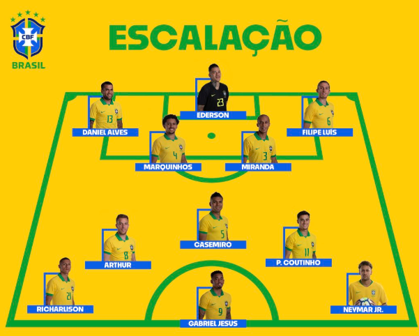 Brazil (4-3-3): Ederson; Fagner, Thiago Silva, Miranda, Alex Sandro; Casemiro, Arthur, Fernandinho; Neymar, Richarlison, Coutinho