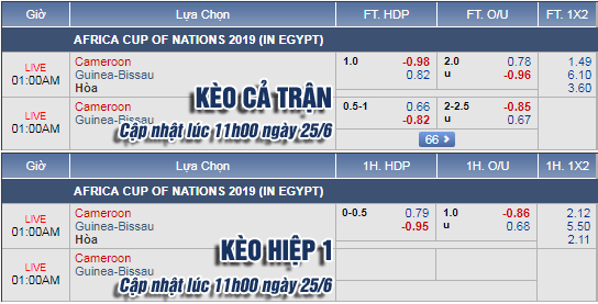 So với phiên khớp lệnh sáng ngày 25/6 thì tỷ lệ chấp của Cameroon vẫn giữ ở mức 1 hòa, tuy nhiên điểm ăn cho cửa trên dịch chuyển theo chiều hướng tích cực với cửa trên, từ mức -0.98 còn 0.93 trước giờ bóng lăn 30 phút. Trong khi đó, mức tài xỉu không có nhiều biến động đáng kể khi vẫn giữ ở mức 2 hòa.