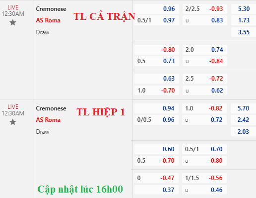 Trên sàn châu Á, kèo chính khách vẫn chấp 3/4 với lợi nhuận tương đối cân bằng giữa các lựa chọn, trong khi tài xỉu vẫn là 2 1/4 cùng điểm bỏ cho lựa chọn tài. AS Roma dù được đánh giá cao nhưng khả năng tấn công cũng không ấn tượng, lại làm khách trận này nên khó xuất hiện kịch bản tưng bừng.
