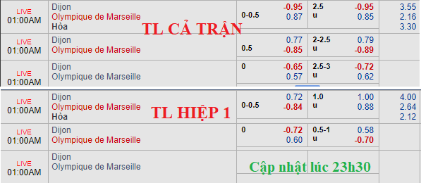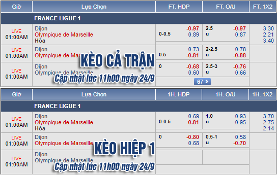 AEGoal.net chốt kèo trực tiếp trận Dijon vs Marseille diễn ra lúc 00h00 ngày 25/9 sau khi dựa trên tính toán, chuyển động về kèo châu Á và đội hình ra sân của 2 đội.