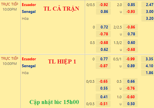 Ecuador vẫn có sự phục vụ của những cái tên đáng chú ý như Valencia, Caicedo, Estrada hay Palata ở đội hình xuất phát. Trong khi đó, Sarr, Dia, Gueye cũng ra sân ngay từ đầu. Trên sàn giao dịch châu Á nhìn chung chứng kiến sự ổn định với kèo chính Ecuador chấp 1/4 cùng lợi điểm bỏ rất sâu đến sát giờ thi đấu.