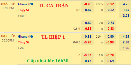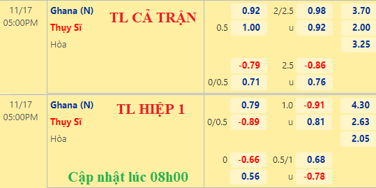 Trên sàn châu Á, Thụy Sĩ vẫn chấp hòa và điểm ăn có giảm đáng kể, trong khi tài xỉu vẫn là 2 1/4. Đội tuyển tới từ châu Âu tung vào sân đội hình mạnh với nhiều nhân tố đáng tin cậy hơn so với một Ghana gồm nhiều cầu thủ trẻ.