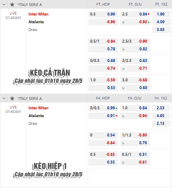 * Chốt kèo trận Inter Milan vs Atalanta (01h45 ngày 28/5)