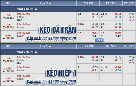 AEGoal.net chốt kèo trực tiếp trận Inter Milan vs Lazio diễn ra lúc 02h00 ngày 26/9 sau khi dựa trên tính toán, chuyển động về kèo châu Á và đội hình ra sân của 2 đội.