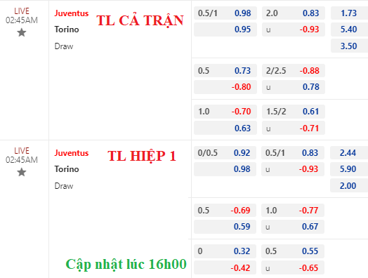 Kèo chính Juventus vẫn chấp 3/4 nhưng điểm ăn lại tiến đến mức bỏ tuy dịch chuyển chưa đáng kể. Tài xỉu 2 hòa ghi nhận điểm ăn ở cửa tài tăng lên, chiếu theo kèo châu Á chủ chấp 3/4 thì rõ ràng mức tài xỉu như vậy là quá thấp.