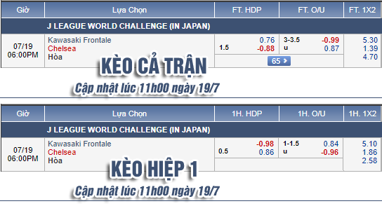 AEGoal.net chốt kèo trực tiếp trận Kawasaki Frontale vs Chelsea diễn ra lúc 17h00 ngày 19/7 sau khi dựa trên tính toán, chuyển động về kèo châu Á và đội hình ra sân của 2 đội.
