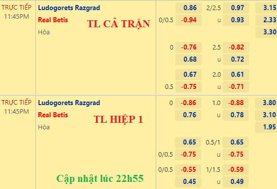 AEGoal chốt kèo bóng đá trực tiếp trận Ludogorets vs Real Betis diễn ra lúc 23h45 ngày 27/10/2022 trong khuôn khổ vòng bảng UEFA Europa League sau khi dựa trên tính toán, chuyển động về kèo châu Á và đội hình ra sân của 2 đội.