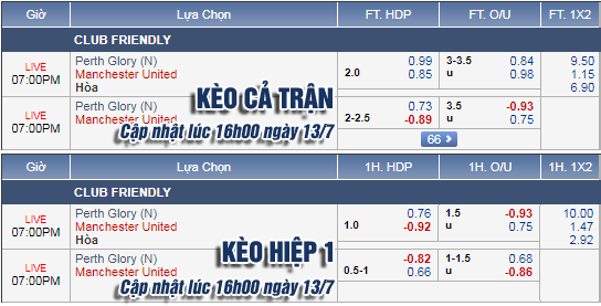 AEGoal.net chốt kèo trực tiếp trận Man Utd vs Perth Glory diễn ra lúc 18h00 ngày 13/7 sau khi dựa trên tính toán, chuyển động về kèo châu Á và đội hình ra sân của 2 đội.