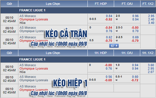 AEGoal.net chốt kèo trực tiếp trận Monaco vs Lyon diễn ra lúc 01h45 ngày 10/8 sau khi dựa trên tính toán, chuyển động về kèo châu Á và đội hình ra sân của 2 đội.