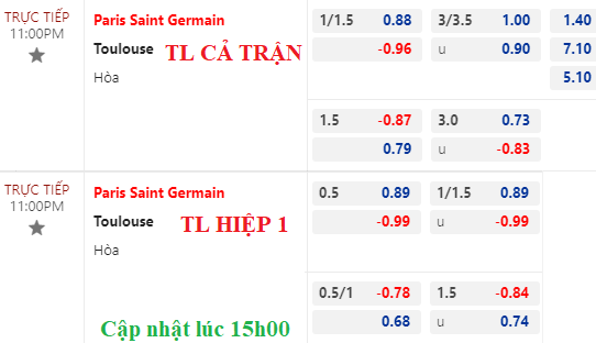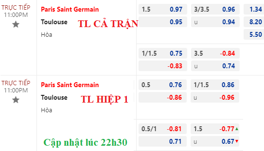 Trên sàn châu Á, PSG từ chấp 1 1/4 chiều nay lên chấp 1 1/2, còn tài xỉu vẫn là 3 1/4. Tuy tỷ lệ cả trận tăng nhưng kèo hiệp 1 PSG vẫn chấp hòa, chưa phải dạng kèo khả quan với cửa trên, đặc biệt khi họ vắng những nhân tố đột biến như Neymar hay Mbappe.