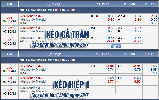 AEGoal.net chốt kèo trực tiếp trận Real Madrid vs Atletico Madrid diễn ra lúc 07h00 ngày 27/7 sau khi dựa trên tính toán, chuyển động về kèo châu Á và đội hình ra sân của 2 đội.