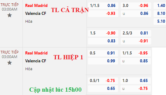 Trên sàn châu Á, Real Madrid vẫn duy trì kèo chấp 1 1/4 và điểm ăn cho họ còn có phần thấp hơn chiều 2/2. Trong khi ấy thì tài xỉu 3 hòa lại bị kéo về còn 2 3/4. Với đội hình thiếu một vài trụ cột, việc Real duy trì kèo chấp như vậy là tín hiệu khả quan cho họ. Valencia thực tế phong độ cũng thất thường và chất lượng nhân sự cũng yếu kém.