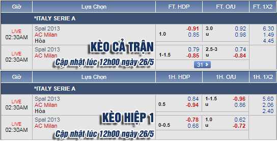AEGoal.net chốt kèo trực tiếp trận SPAL vs AC Milan diễn ra lúc 01h30 ngày 27/5 sau khi dựa trên tính toán, chuyển động về kèo châu Á và đội hình ra sân của 2 đội.
