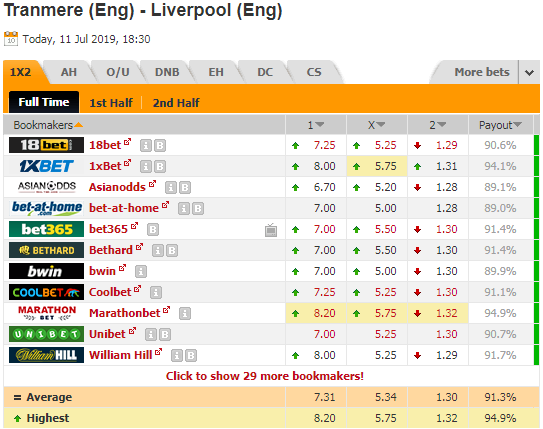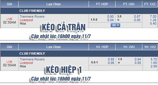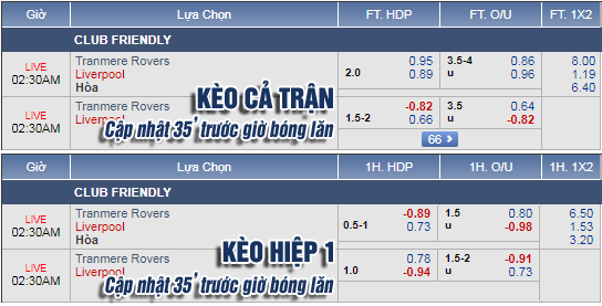 AEGoal.net chốt kèo trực tiếp trận Tranmere Rovers vs Liverpool diễn ra lúc 01h30 ngày 12/7 sau khi dựa trên tính toán, chuyển động về kèo châu Á và đội hình ra sân của 2 đội.