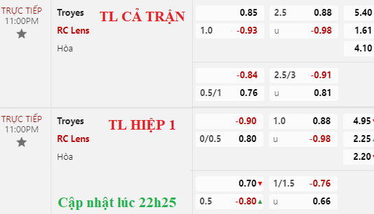 Trên sàn châu Á, Lens lên chấp 1 hòa nhưng bỏ sâu, trong khi tài xỉu vẫn là 2 1/2. Tuy kèo cả trận nhích lên nhưng kèo hiệp 1 Lens vẫn chỉ chấp đồng banh, đó là tỷ lệ chưa khả quan dành cho khách trước đối thủ thua kém nhiều bậc.
