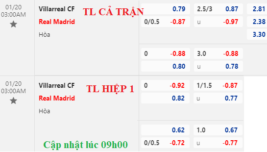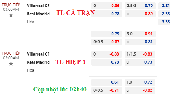 Kèo chính vẫn dao động giữa mức Real Madrid chấp về giá và chấp 1/4, trong khi tài xỉu 2 3/4 ghi nhận lợi nhuận cho cửa tài giảm sâu, dần đưa mốc chính lên mức 3 hòa. Dịch chuyển về tỷ lệ như vậy chưa rõ ràng với cửa handicap nào.