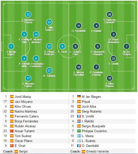 Ở trận này, Barcelona có 2 sự thay đổi so với trận đầu ra quân, Sergi Roberto sẽ trở lại vị trí hậu vệ phải thay Nelson Semedo, trong khi đó Coutinho cũng có mặt trong đội hình chính thức, với cách bố trí này, với sự thay đổi này khả năng tấn công của Barcelona đang hứa hẹn sẽ có nhiều đột biến hơn so với trận mở màn.